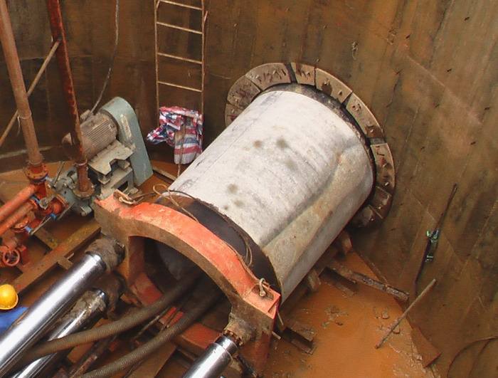 2初始頂進的鋼管外側埋設預埋鋼板,在主推千斤頂退回前將鋼管與井壁相連,直至鋼管外壁摩阻力大于掘進機正面水土壓力為止。